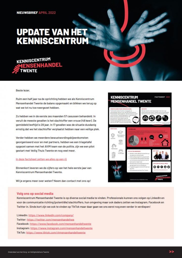 Ruim een half jaar na de oprichting hebben we als Kenniscentrum Mensenhandel Twente de balans opgemaakt en blikken we terug op wat we tot nu toe neergezet hebben. Dit en meer lees je in de nieuwsbrief van april.
