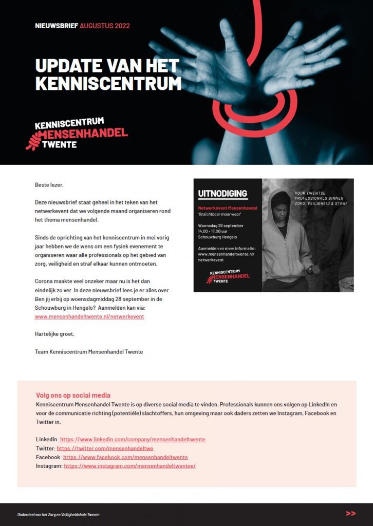 In de laatste update van Kenniscentrum Mensenhandel Twente lees je alles over het netwerkevent van volgende maand.