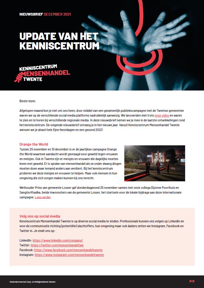 Afgelopen maand kon je niet om ons heen, door middel van een gezamenlijk publiekscampagne met de Twentse gemeenten waren we op de verschilende social media platforms nadrukkelijk aanwezig. We lanceerden met trots onze video en waren te zien en te horen bij verschillende regionale media. In deze nieuwsbrief nemen we je mee in de laatste ontwikkelingen rond het kenniscentrum. De volgende nieuwsbrief ontvang je in het nieuwe jaar. Vanuit Kenniscentrum Mensenhandel Twente wensen we je alvast hele fijne feestdagen en een gezond 2022!